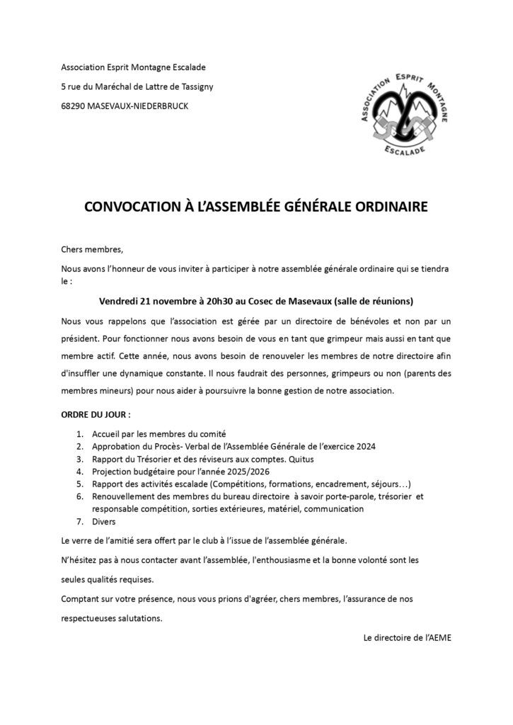 Nous vous invitons donc à notre assemblée générale ordinaire qui se tiendra le vendredi 21 novembre à 20h30 au COSEC de Masevaux, dans la salle de réunions.